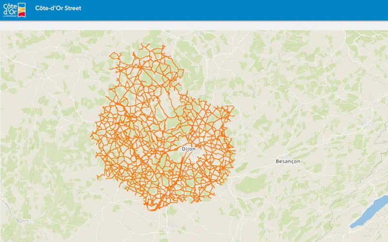 Côte-d’Or Street permet de se promener sur les 8 489 km du réseau routier et véloroutier dépendant du département. Il n’est donc pas possible de se promener dans toute la Côte-d’Or et cela exclut la quasi-totalité du réseau routier de la capitale de la région Bourgogne, Dijon.